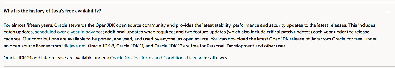 - Oracle 인수 이후 (2010년 이후): Oracle이 Sun Microsystems를 인수한 후에도 한동안 기존 정책과 유사하게 유지되었습니다. 하지만 시간이 지나면서 Oracle은 상업적인 목적의 JDK 사용에 대한 라이선스 정책을 변경하기 시작했습니다.