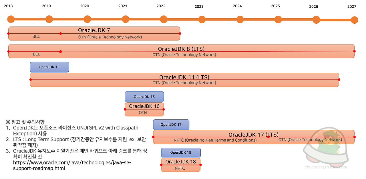 - BCL (Binary Code License) 시대: Oracle JDK는 BCL 라이선스 하에 배포되었으며, 개발 및 테스트 용도로는 무료로 사용할 수 있었지만, 상업적인 배포에는 유료 라이선스가 필요하게 되었습니다. 이 시기에 OpenJDK의 중요성이 부각되기 시작했습니다.