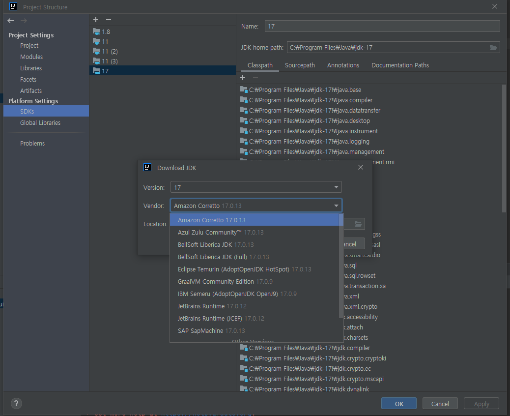 직접 Open JDK 를 다운로드 하기 위해 찾아보았는데 인텔리제이에서 [project 설정] - [Plaform settings] - Open JDK 다운로드가 있습니다. 즉, Open JDK 벤더사가 있는데 벤더사가 무료로 Open JDK 를 배포 하여 제공하는 것입니다.